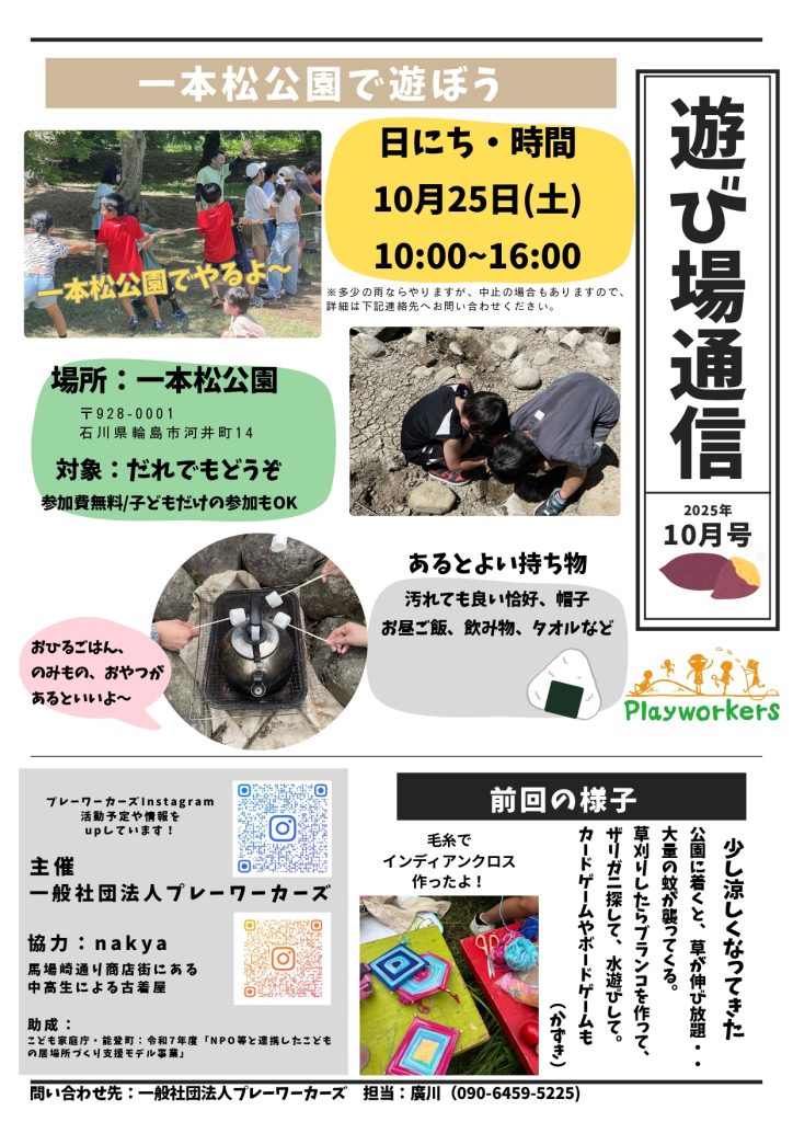 • 2025年10月21日プレーパーク情報【石川県】輪島市での遊び場(10/25)